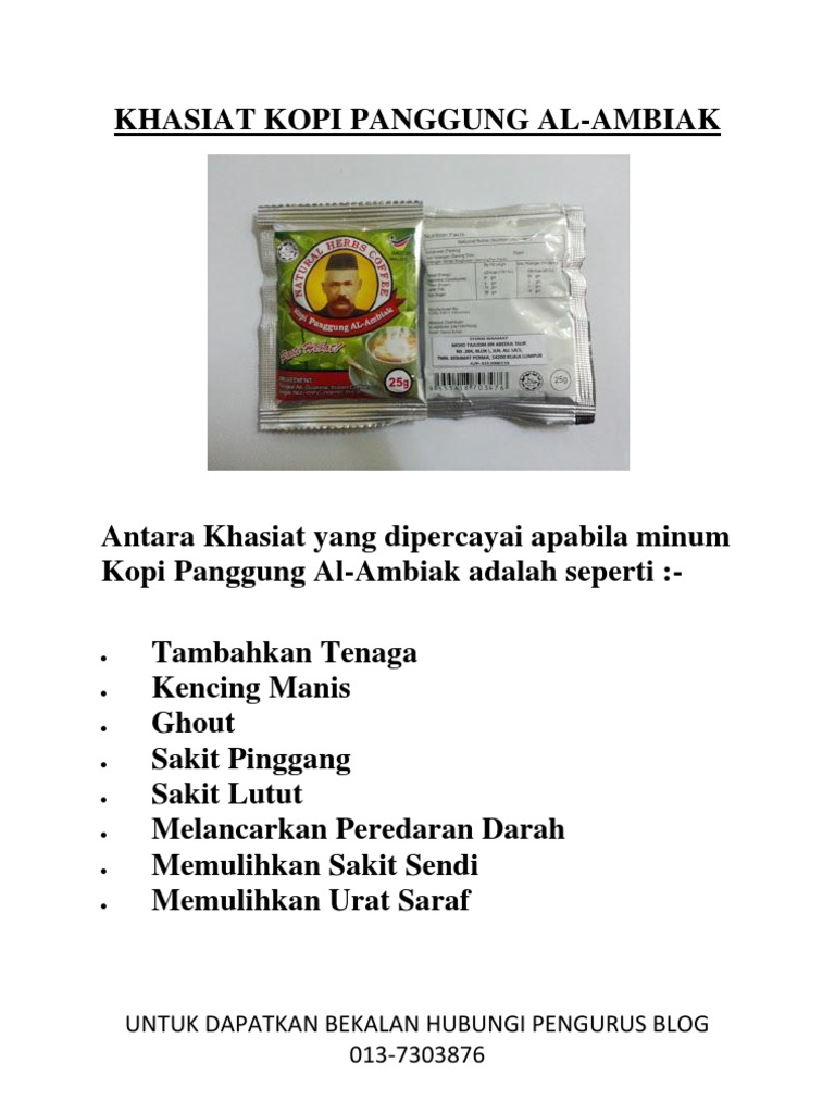6 Membantu Bakar Lemak. PEMBORONG DAN STOKIS KOPI PANGGUNG AL AMBIAK KOPI MISAI KOPI SONGKOK ORIGINAL RAMUAN UTAMA. Ia merupakan proses tindak balas bahan yang terkandung dalam herba Kopi Panggung Al-Ambiak dengan sistem tubuh badan khususnya sistem berkaitan darah kadar kolesterol kualiti peredaran darah - circulatory system kadar gula dan kadar toksid dan sistem saraf.
